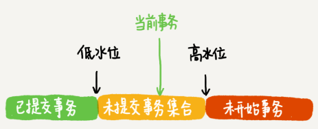 数组里面事务 ID 的最小值记为低水位,当前系统里面已经创建过的事务 ID 的最大值加 1 记为高水位。