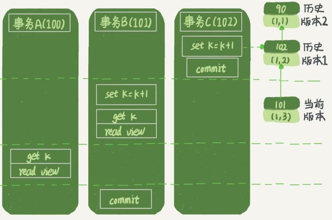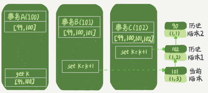 所以事务 A 执行 get k 时,因为 101 未提交所以不可见,而 102 属于已提交可见。所以最终返回 k = 2。