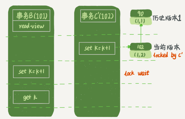 而当出现下面的情况:事务 C’ 修改 k 后并没有提交,这时候事务 B 修改 k 会发生什么呢?