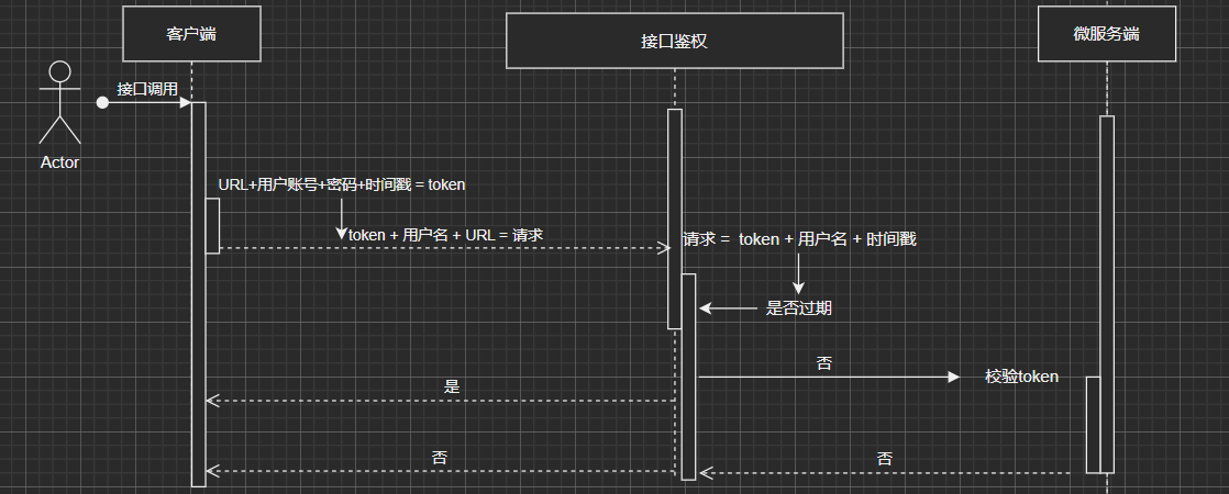 - 拼接 URL、用户名、时间戳和密码,并加密成 token,再将 token、用户名和时间戳拼接到 URL 中并发送到微服务端