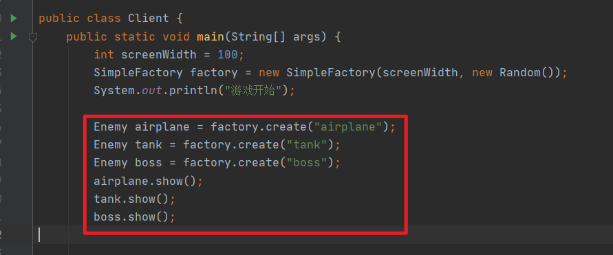 我们发现游戏正常运行起来了,但是有个问题,没有 Boss 啊!这时我们需要添加一个 Boss 类,然后又写一段重复的创建敌人的代码,于是一旦增加敌人我们就要修改客户端程序,显然敌人的创建、初始化逻辑耦合在了客户端当中,这时简单工厂就发挥作用了: