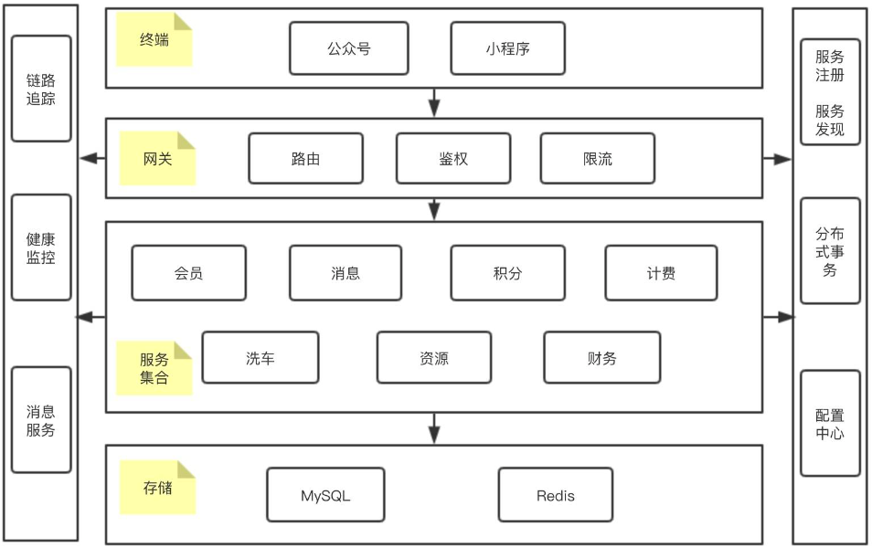 没有最优的架构,只有最合适的架构,一切系统设计原则都要以解决业务问题为最终目标,并随着业务的发展,不断进行迭代演进。经过上面业务模块、存储模型的划分,基本的代码架构已经清晰可见。综合业务模块、微服务架构特性,输出功能架构设计图。