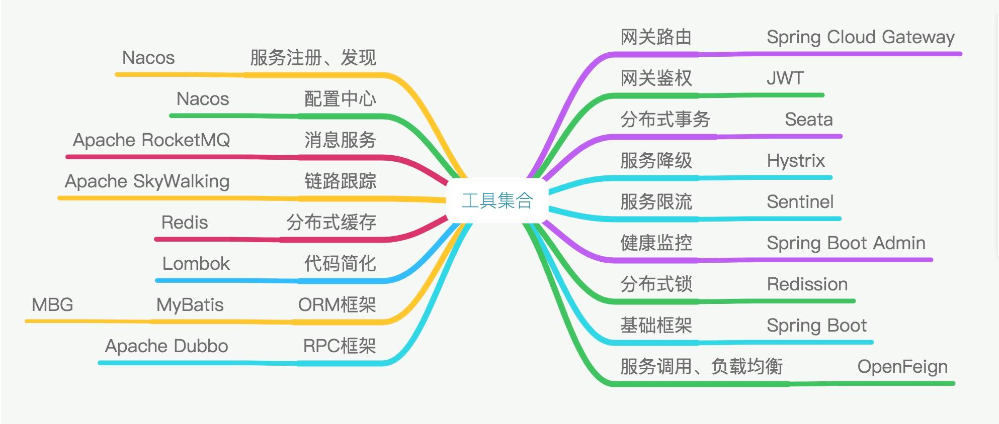 基于总体功能架构图,使用特定的功能组件即可实现相应的功能。前期也提到,Spring Cloud 全家桶中囊括了很多组件,开箱即用,这对快速上手微服务开发提供了极大的便利。同时,再融入时常开发实践一些常用的高效工具来提升编码效率如 Lombok,MBG 等。