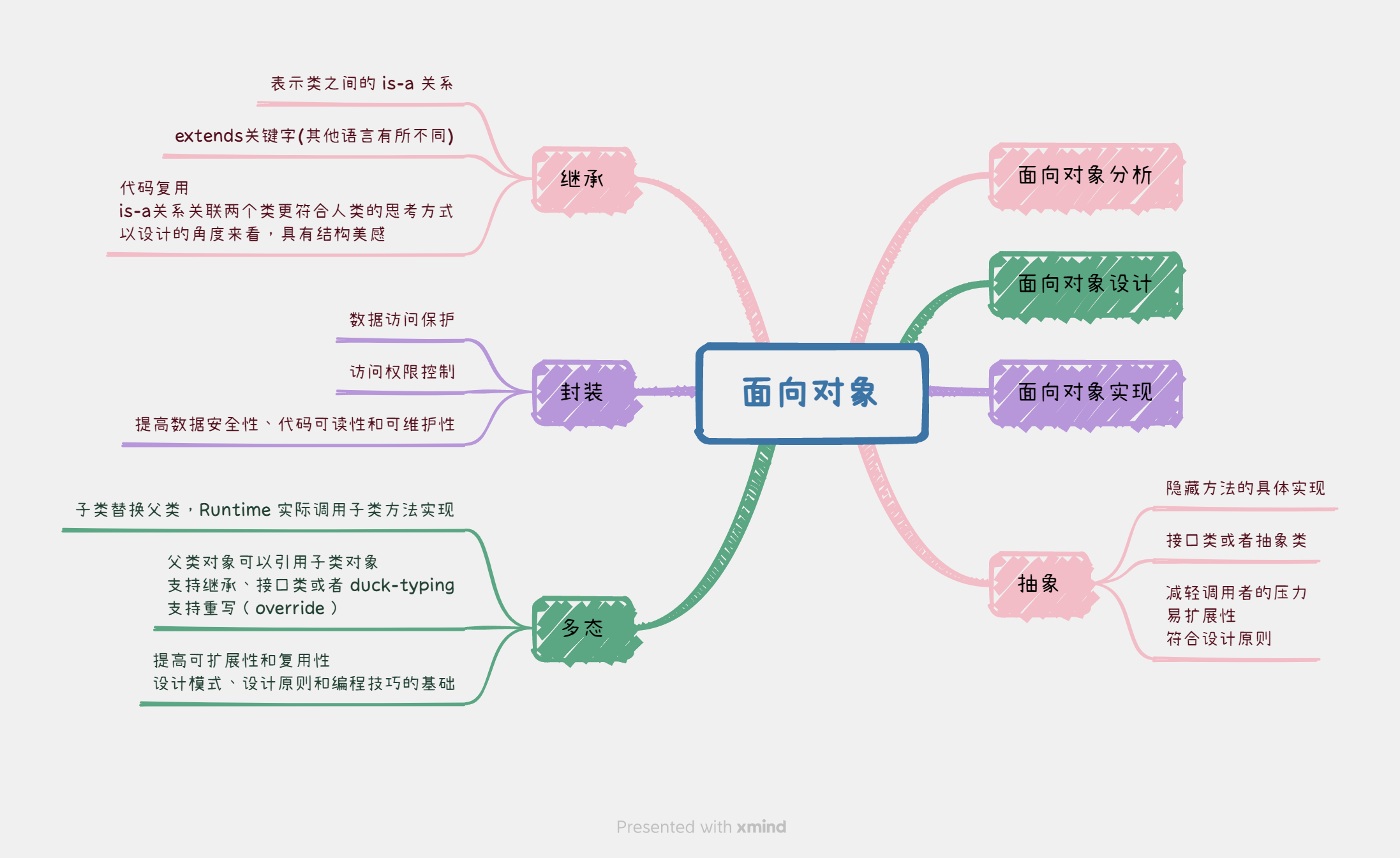 - 多态也是很多设计模式、设计原则、编程技巧的代码实现基础,比如策略模式、基于接口而非实现编程、依赖倒置原则、里式替换原则、利用多态去掉冗长的if-else语句等等。