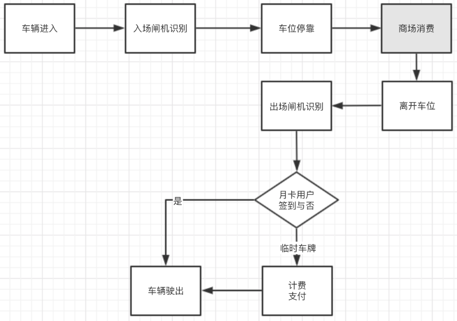 - 会员,会员信息(主要是姓名、手机号、生日),车辆信息(主要车牌信息),月卡信息(充值一定金额后,指定区间内免支付出入场,针对商场的工作人员或办公区的白领),签到信息