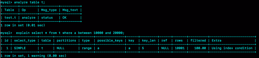 其中 rows 对应的就是扫描行数,如果发现预估的扫描行数与实际选中对应的索引会扫描的行数相差过大,这时候可以使用 analyze table your_table_name; 用来重新统计索引信息。